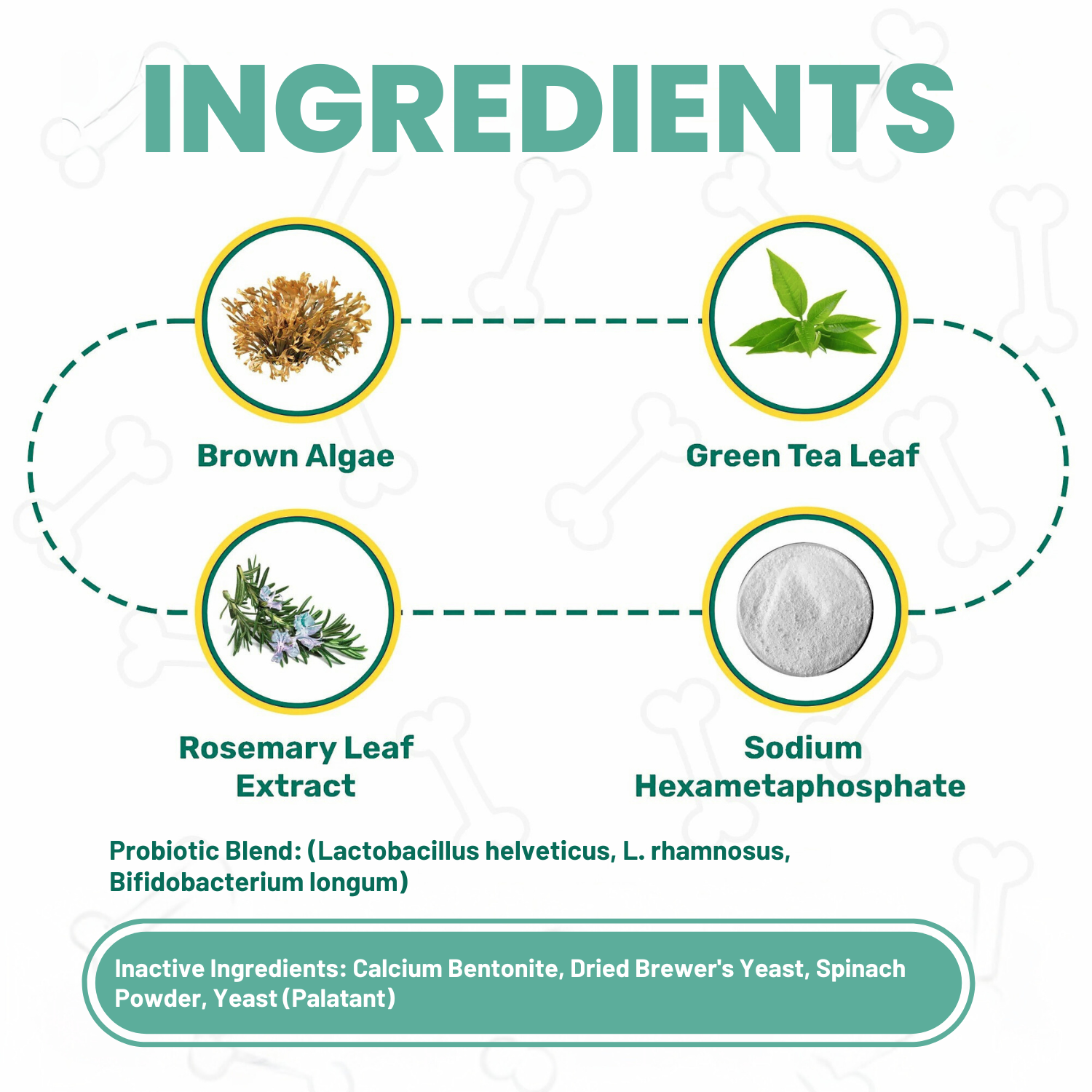 WellHound uses a triple-action formula to tackle dental health from multiple angles. First, our Brown Algae (Ascophyllum nodosum) is absorbed into your dog's saliva, where it works to soften existing plaque and tartar, making it easier to remove. Second, Sodium Hexametaphosphate (HMP) creates a barrier on the teeth to help prevent new tartar from forming. Finally, our Triple-Strain Probiotic Blend helps balance the oral microbiome, targeting the root cause of bad breath and promoting healthier gums.